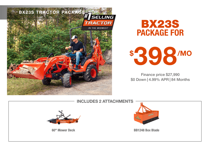 Monthly payment includes tractor and implements. KTAC insurance, taxes, and additional charges are not applied to monthly payment or financed price. Financing is subject to credit approval and terms from Kubota Credit Corporation.