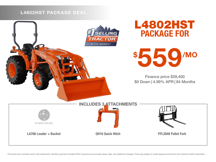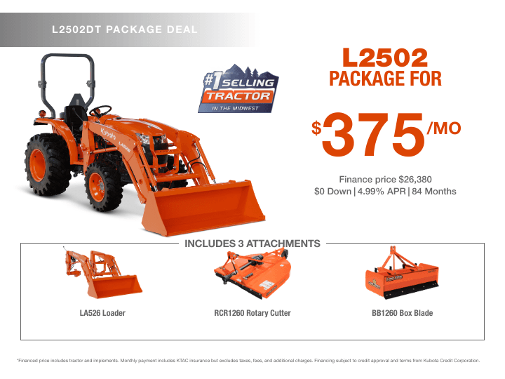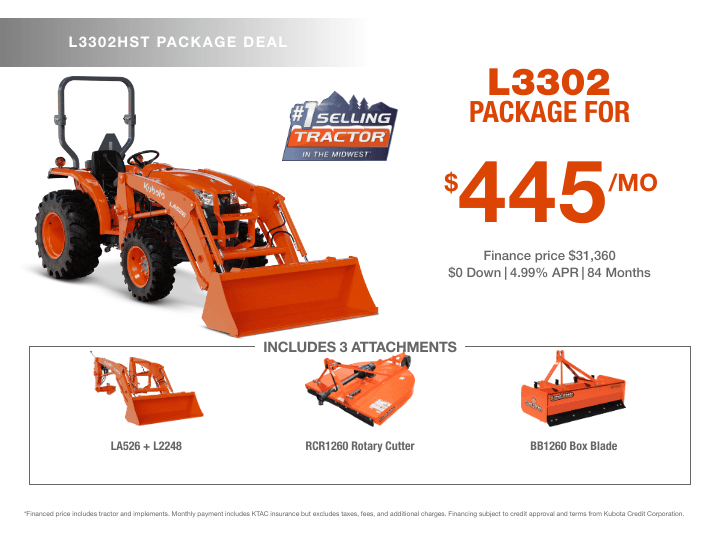 Monthly payment includes tractor and implements. Kubota Financing $150 processing fee, KTAC insurance, taxes, and additional charges are not applied to monthly payment or financed price. Financing is subject to credit approval and terms from Kubota Credit Corporation.