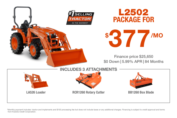 Monthly payment includes tractor and implements and $150 processing fee. KTAC insurance, taxes, and additional charges are not applied to monthly payment or financed price. Financing is subject to credit approval and terms from Kubota Credit Corporation.