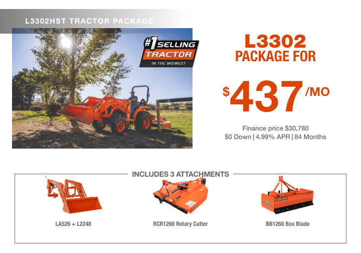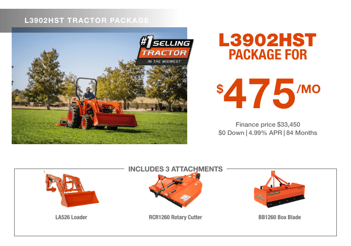 Monthly payment includes tractor and implements. KTAC insurance, taxes, and additional charges are not applied to monthly payment or financed price. Financing is subject to credit approval and terms from Kubota Credit Corporation.
