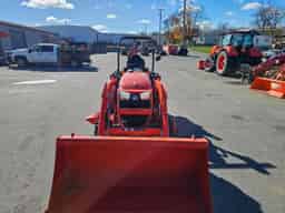 Implements installed: Loader, backhoe, mower deck — all Kubota OEM