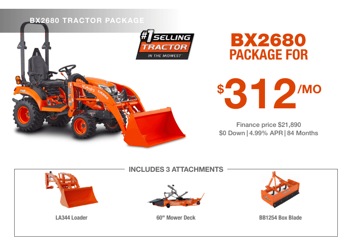 Monthly payment includes tractor and implements. KTAC insurance, taxes, and additional charges are not applied to monthly payment or financed price. Financing is subject to credit approval and terms from Kubota Credit Corporation.